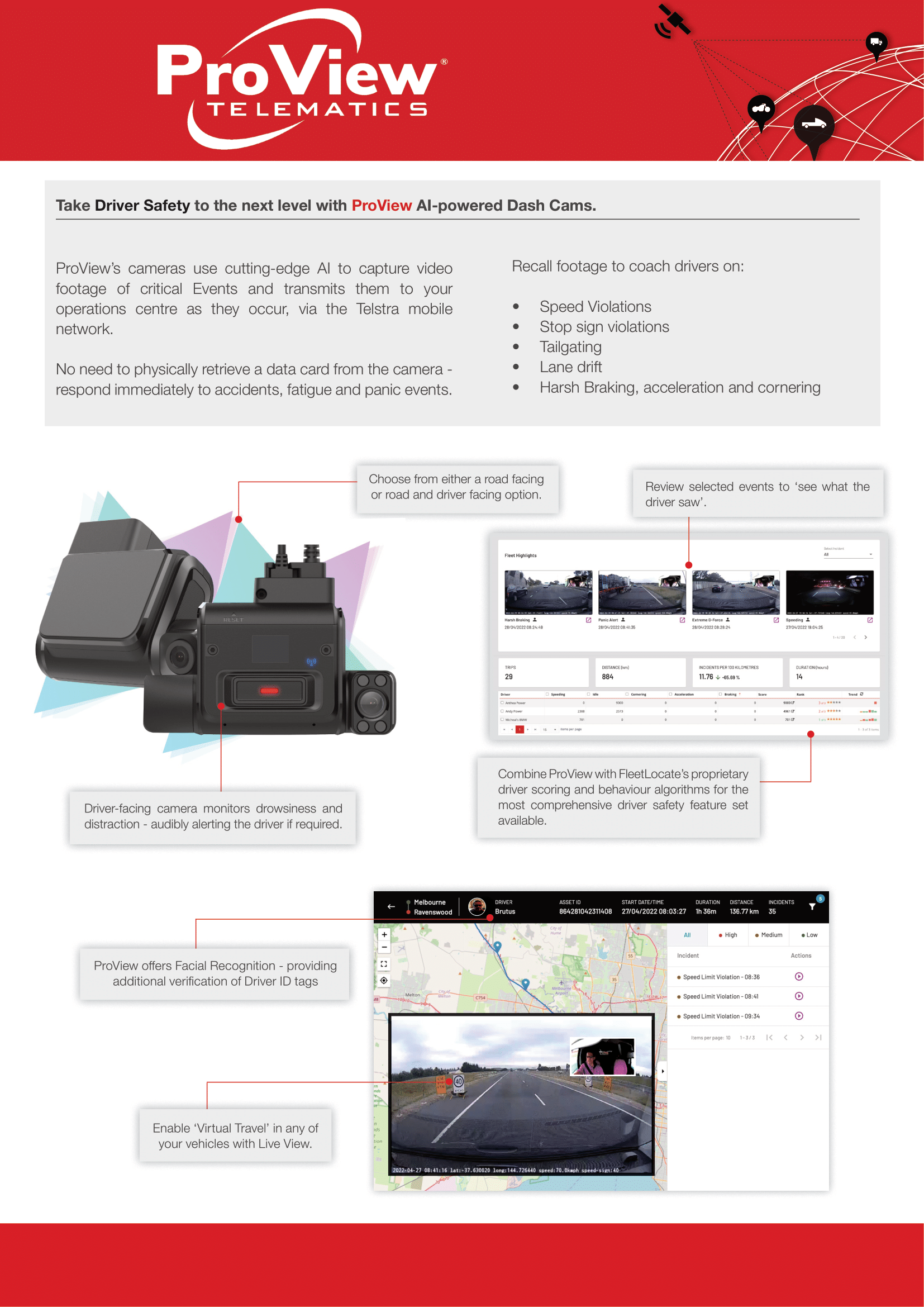 ProView cameras use cutting-edge AI to capture video footage of critical events and transmit them to your operations centre as they occur, via the Telstra mobile network. No need to physically retrieve a data card from the camera – respond immediately to accidents, fatigue and panic events.